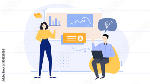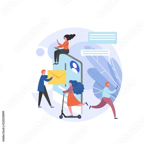 Happy young people male and female characters using mobile phones, vector illustration. Modern means of communication concept for web banner, website page etc.