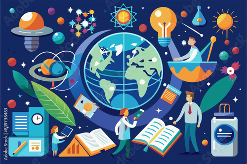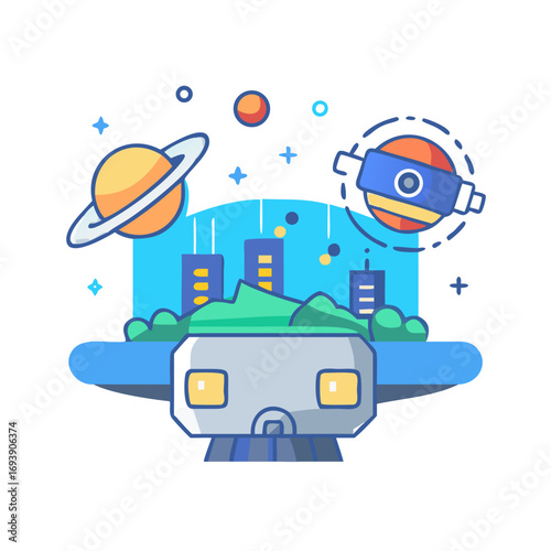 New technologies vector flat illustration. Human brain on hand palm, dna symbol, lab flasks, globe computer with world map, robotics, vr glasses. New technology advancements and products poster banner