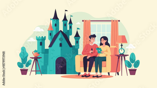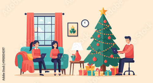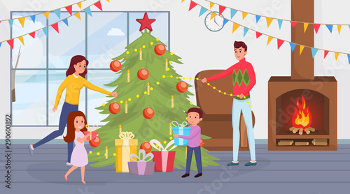 Micro male and female characters decorating fireplace with Christmas wreath, stockings, candles and preparing gifts, vector illustration. Christmas and New Year celebration concept.