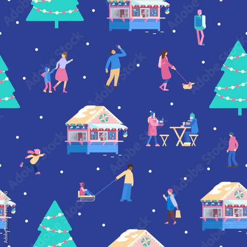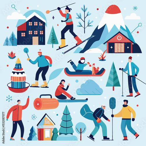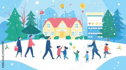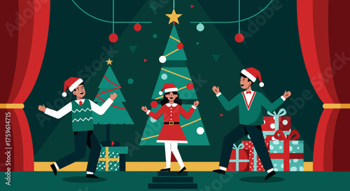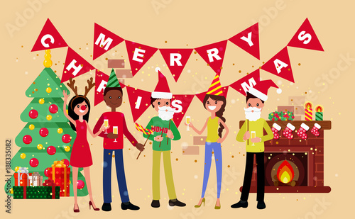 New Year typography banner template. Happy people in Santa hats dancing, drinking wine, having fun, flat vector illustration. New Year corporate party celebration.