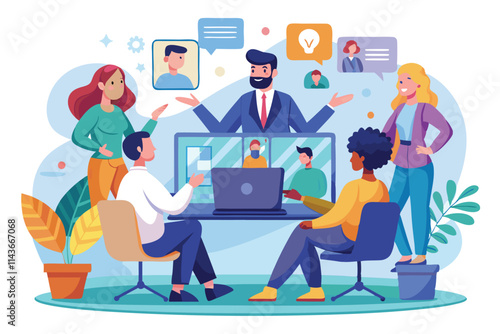 NFT crypto art auction, flat vector illustration. Auctioneer selling digital artwork, bidders making bids. Non fungible token, blockchain NFT marketplace, metaverse auction.