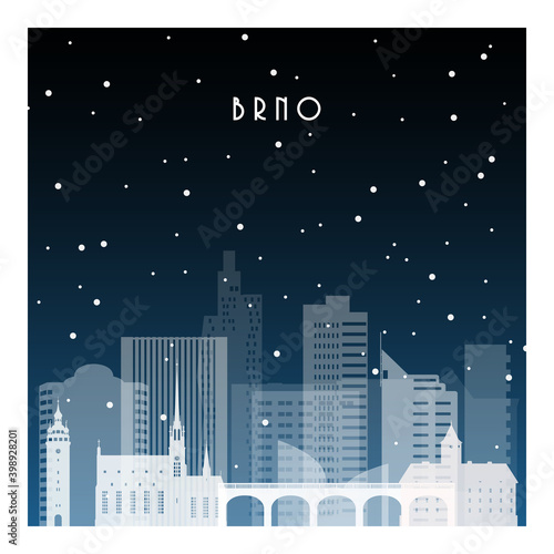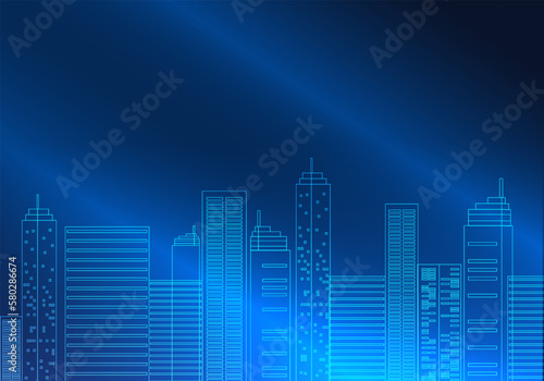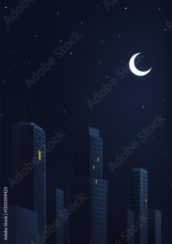 Night city blackout, vector illustration. Cityscape with starry sky, moon and skyscraper building silhouettes without electricity. Dark city skyline. Power outage.