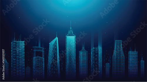 Night city blackout, vector illustration. Cityscape with starry sky, moon and skyscraper building silhouettes without electricity. Dark city skyline. Power outage.