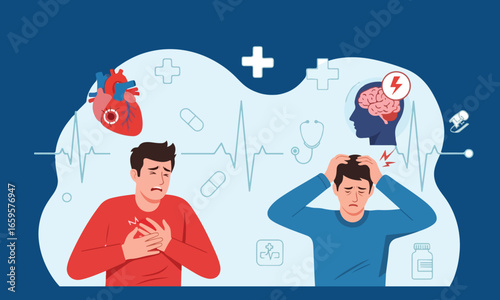 Noise pollution poster. Vector people suffering from loud noisy city sound illustration. Man woman dwellers covering ears to stop hearing tinnitus