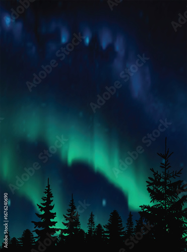 Beautiful colored northern lights, realistic aurora borealis, vector illustration. Night sky and amazing polar lights for poster, banner etc.