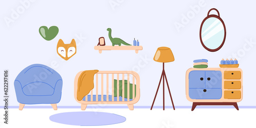 Nursery room interior hand drawn vector illustration. Home modern interior design. Newborn child room furniture and accessories. Baby crib, chair, kids toys, playground.