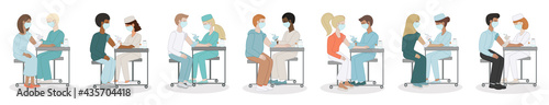 Vector illustration of nutritionist or dietician doctor male consulting his patient female. Medical practitioner flat style design element, icon isolated on white background.