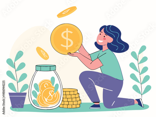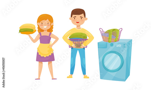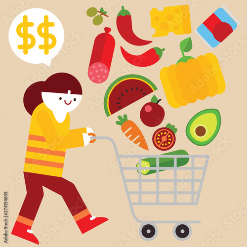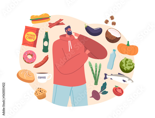 Obesity and weight problems. Young woman choosing between healthy and unhealthy food, flat vector illustration. Weight loss and healthy lifestyle. Junk food vs healthy balanced menu.