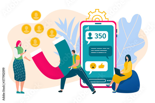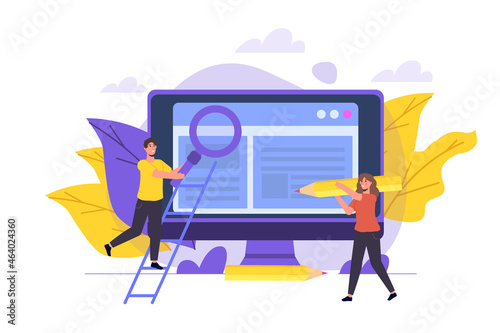 Oculist vector flat illustration. Tiny characters patient and doctor pointing at eye test chart on big computer monitor. Optometry, ophthalmology diagnostics, eyesight test and correction concept.
