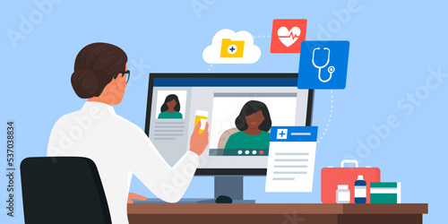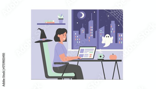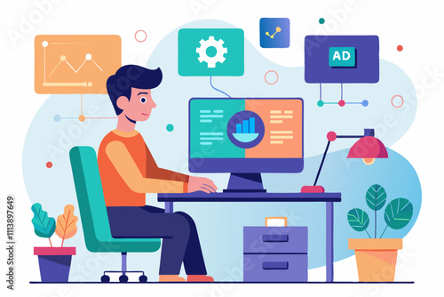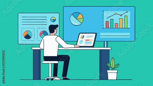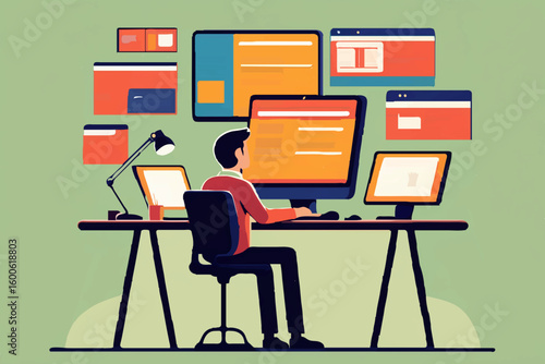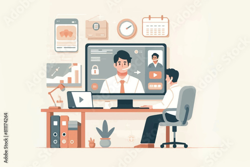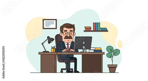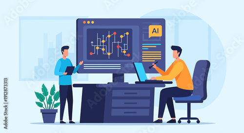 Office workplace and businessman cartoon characters discussing something while working on computer, standing near desk with tablet in hand, vector flat illustration. Businessman daily routine work.