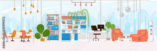 Office interior. Vector illustration in flat style design. Modern office rooms with furniture.