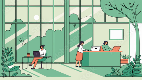 Vector illustration of modern workspace interior with office furniture and equipment, employees working on laptop, meeting with partners. Office life concept, flat style design.