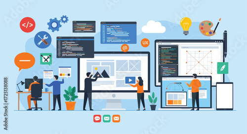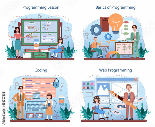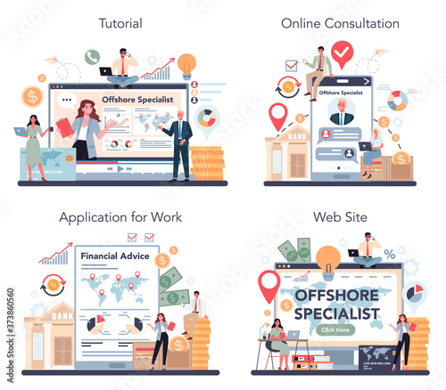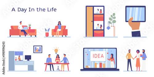 Vector set of posters, banners with modern workspace interior and employees working on laptop, meeting with partners, giving presentation, taking coffee break. Office life concept, flat style design.