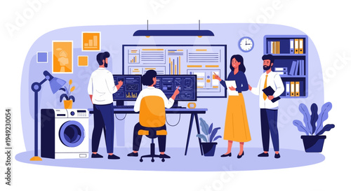 Office life concept vector illustration in flat style. Female workers in office interior. Women have coffee break and talk next to office cooler.
