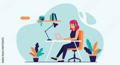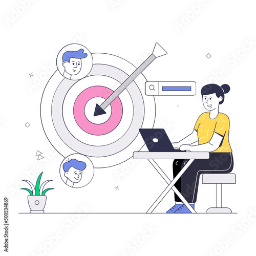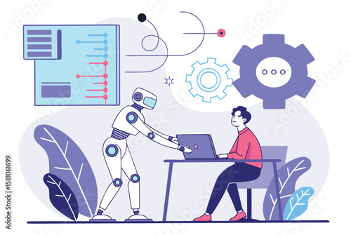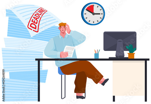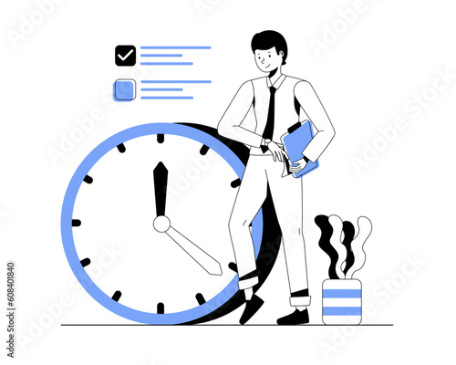Office man working on laptop. Clock, target, checklist business symbols, flat vector illustration. Time management, schedule, task planning.