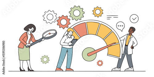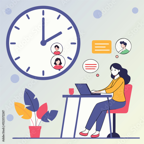 Office man working on laptop. Clock, target, checklist business symbols, flat vector illustration. Time management, schedule, task planning.