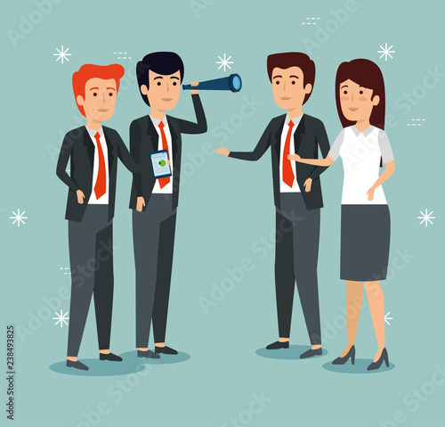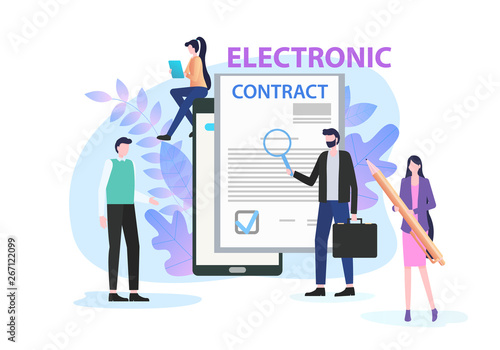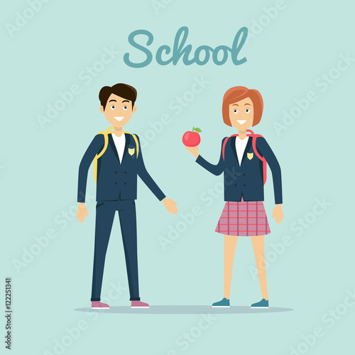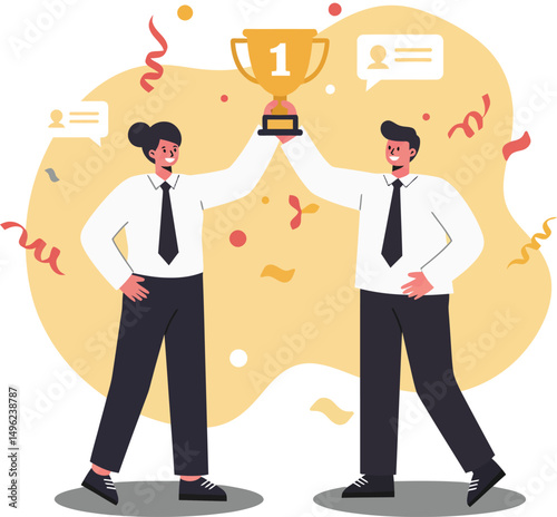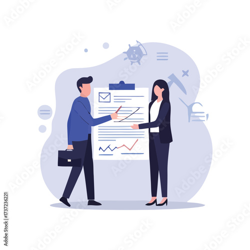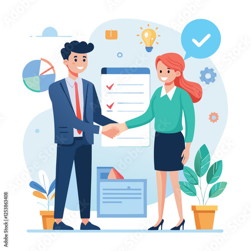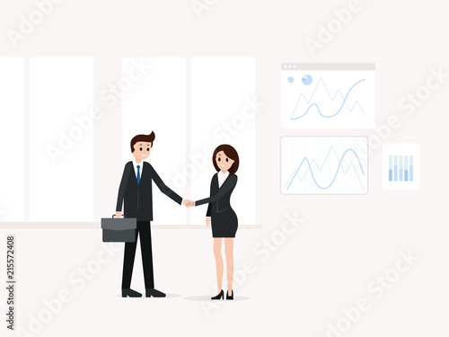 Vector illustration of businessman and businesswoman making a great deal and shaking hands. Office people flat style design elements, icons isolated on white background.