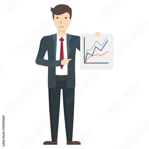 Vector illustration of smiling businessman in suit standing with one hand in pocket. Office people flat style design element, icon isolated on white background.