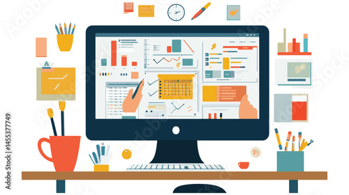 Business people in different office situations, vector flat illustration. Miniature male and female characters working on laptop, taking coffee break. Office daily routine, time management composition