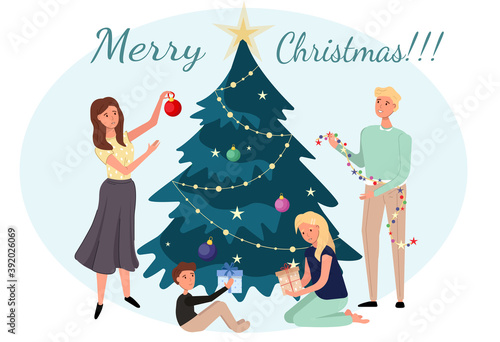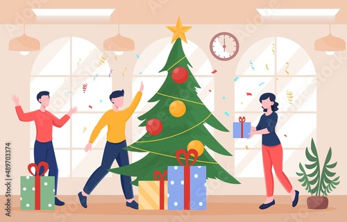 Tiny office people decorating giant Christmas tree and preparing gifts to put them under the tree, flat vector illustration. Preparation for Merry Christmas and New Year holidays party celebration.