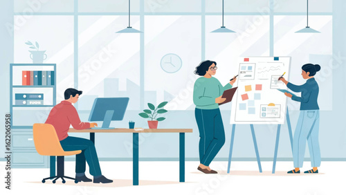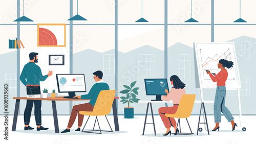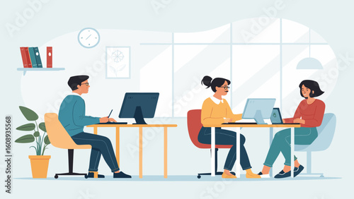 Business people planning, discussing problems sitting at table in office, flat vector illustration. Business meeting, workshop, teamwork, brainstorm, training.