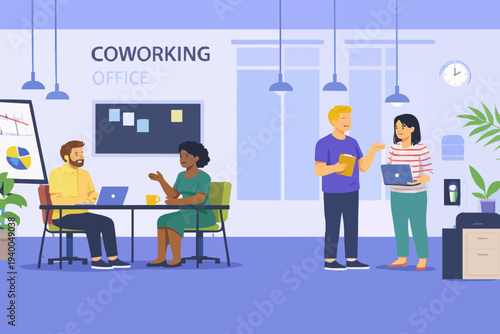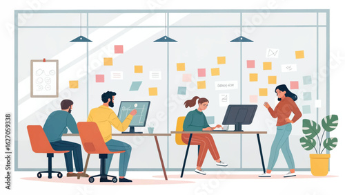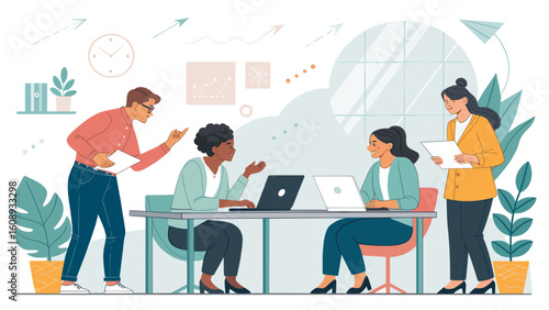 Business people planning, discussing problems sitting at table in office, flat vector illustration. Business meeting, workshop, teamwork, brainstorm, training.