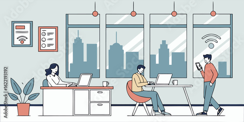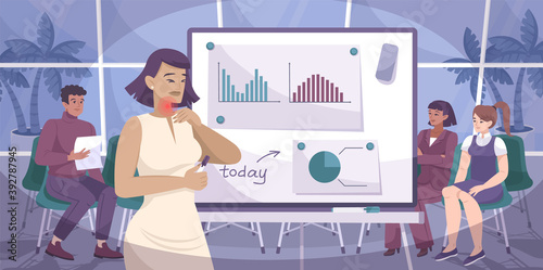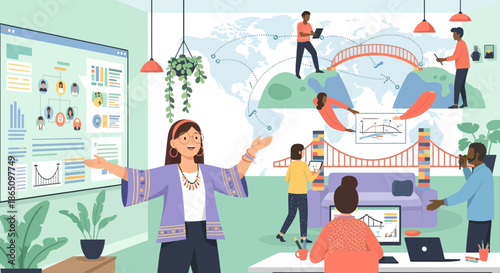 Office people working on computer, giving presentation, planning, managing work with scrum kanban board, flat vector illustration. Agile teamwork, agile project management, workflow.