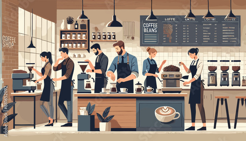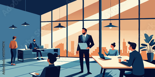 Office scene set, flat vector illustration. Employee, male and female characters working on computer, packing things in cardboard boxes. Workflow, moving and relocation to new office space.