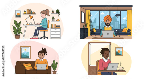 Office scene set, flat vector illustration. Business people, male and female characters working on computers, practicing yoga. Office interior with modern ottomans, high table, vision board.
