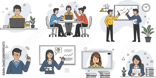 Office scene set, flat vector isolated illustration. Business people working on computer, taking coffee break, giving presentation, meeting, training, planning their work. Office situations.
