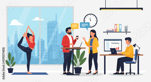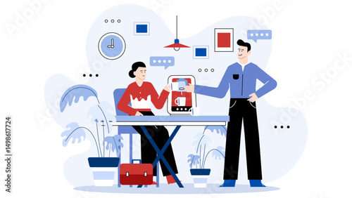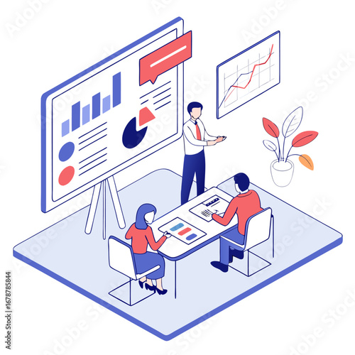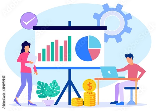Office scene with business man giving lecture or presentation, flat vector illustration. Business people meeting, training, conference, office situation.