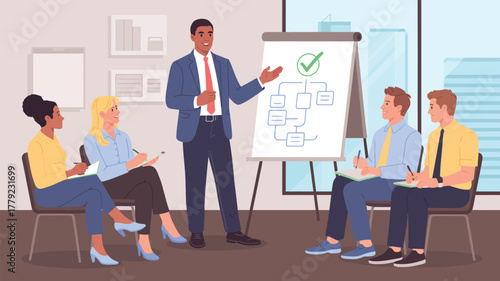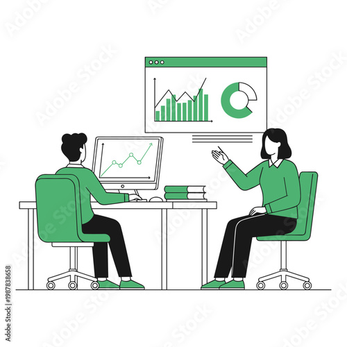 Office scene with modern workplace, two business women colleagues taking coffee break and talking to each other, vector flat illustration. Work schedule, lunch time, office situation, time management.
