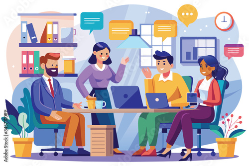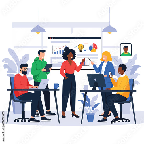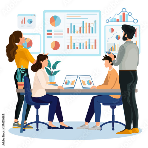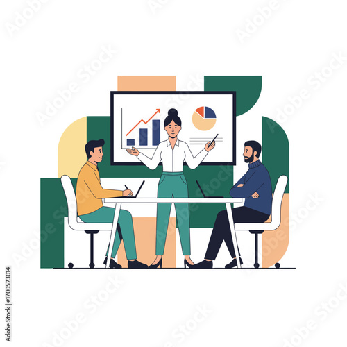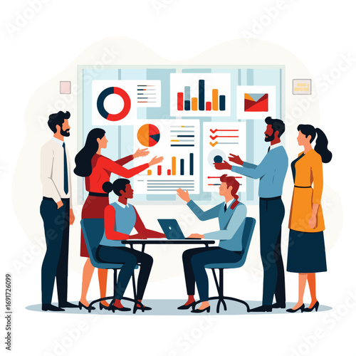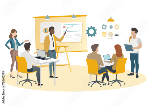 Office team scene set, flat vector isolated illustration. Business people meeting, discussion, partnership, handshake, workshop, presentation, best deal. Team work concept.