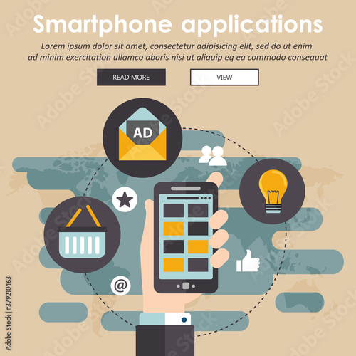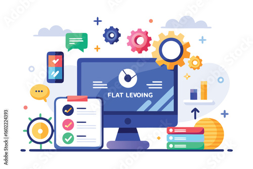 Office work vector flat illustration. Desktop computer, smartphone, clipboard with contract form, stationery, photo in frame and hand drawing with pencil on monitor. Office workspace poster, banner.