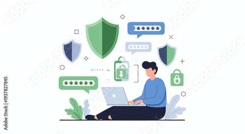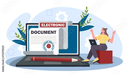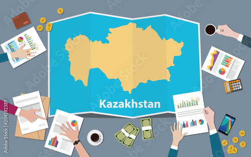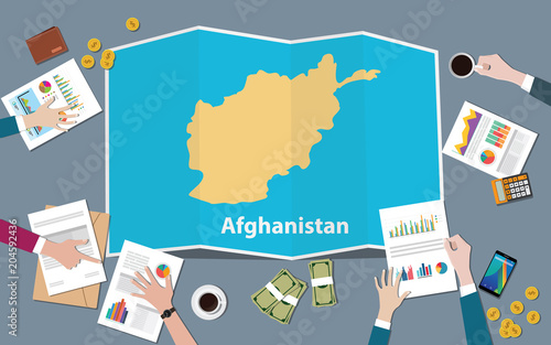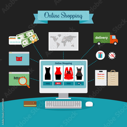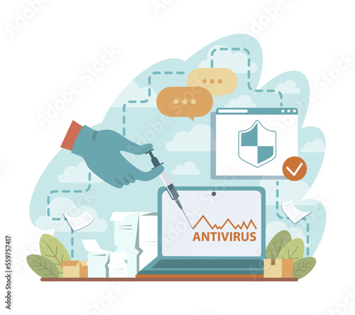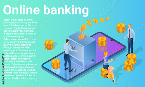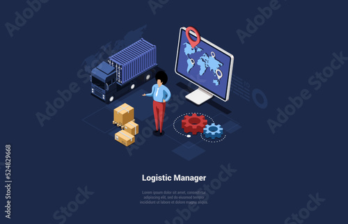 Office work vector flat illustration. Laptop with world map on screen , cactus, cup of tea, desk lamp, folders, watch, paper money and hand with dollar coin. Office workplace, workspace poster, banner