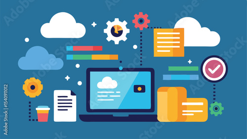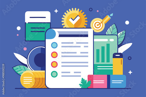 Office work vector flat style design illustration. Desktop computer, smartphone, mouse, purse with dollar coin, notepad, cactus and cup of tea. Office workplace poster, banner.