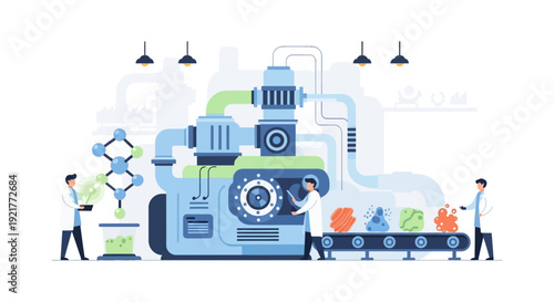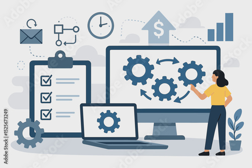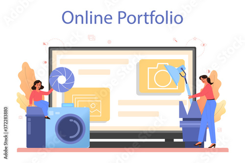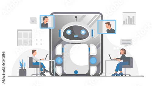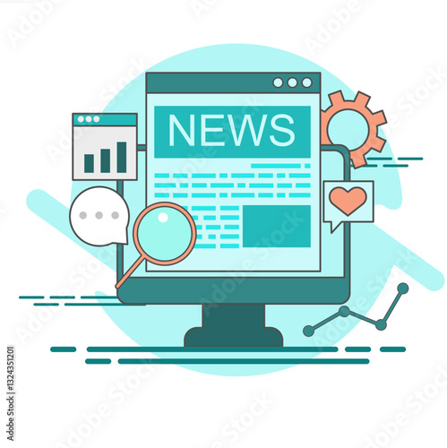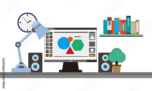 Office people with lamp and magnifying glass looking at world map on huge desktop computer screen, vector flat style design illustration. Office situations, teamwork, money making concept.