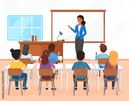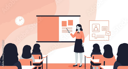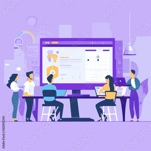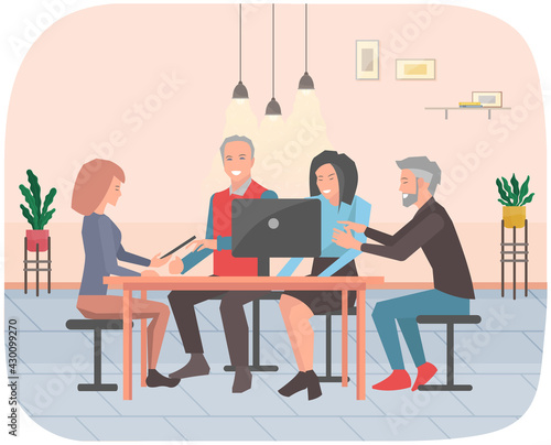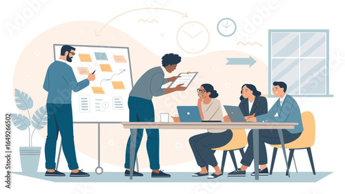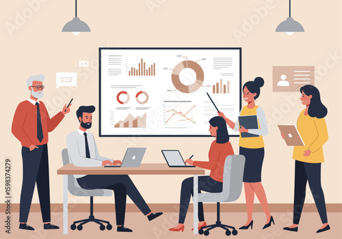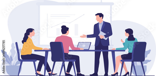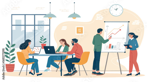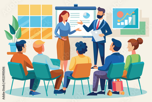 Office work, flat vector illustration. Business people giving presentation, meeting and discussing problems. Partnership, handshake, workshop, team work. Office situations.
