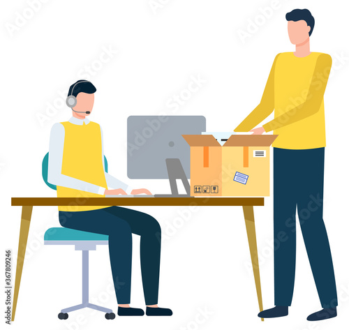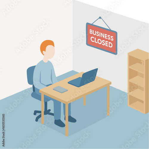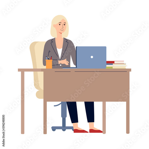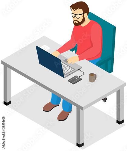 Office worker at computer vector icon. Man sitting at desk working online isolated on white background