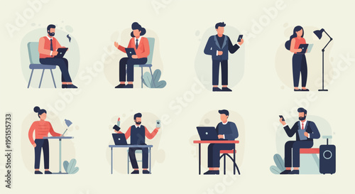 Workers male and female characters in different office situations, vector flat isolated illustration. Business people working on laptop computers, giving presentation, having discussion, brainstorming