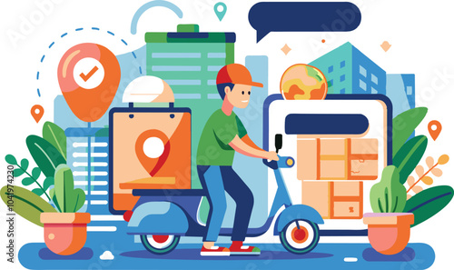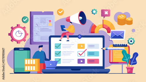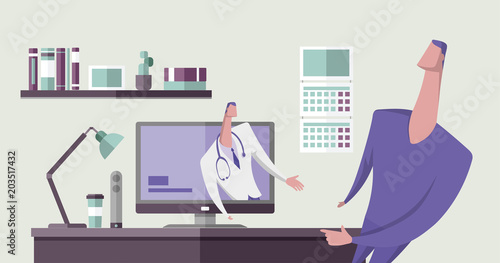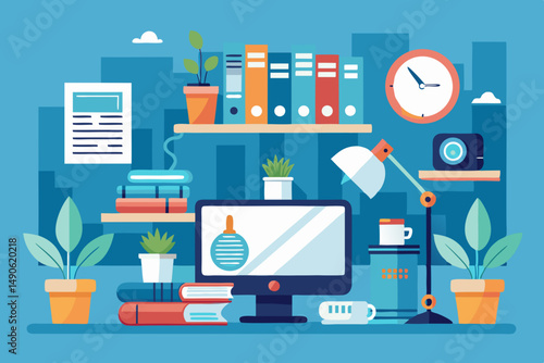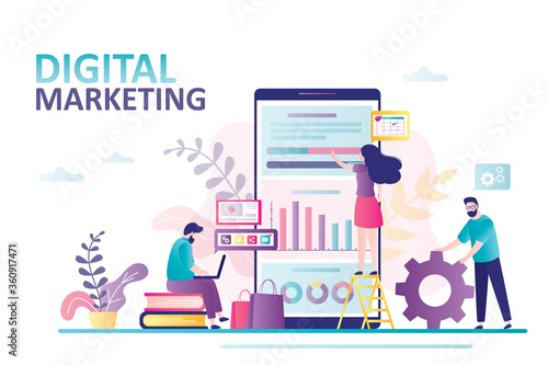 Office work vector poster template. Huge smartphone, computer with workplace, charts on screens, office people meeting, shaking hands, working on laptop computer, flat style design illustration.