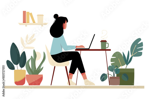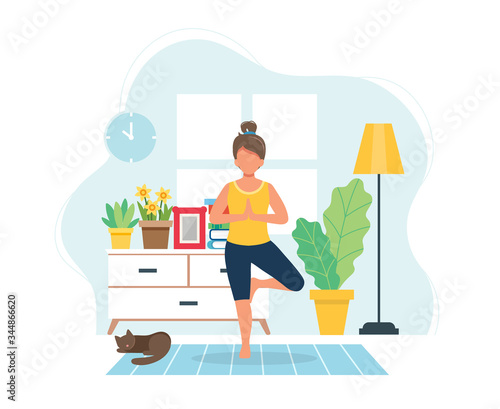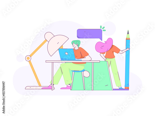 Office yoga and meditation, vector flat illustration. Girl taking rest, meditating sitting in lotus yoga pose, getting energy like charging battery, man throwing computer briefcase in office waste bin