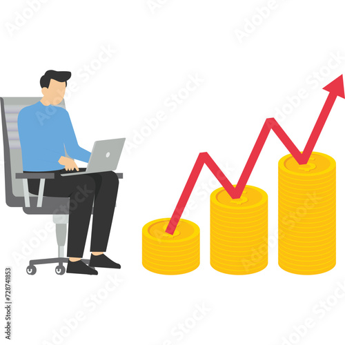 Oil price growth vector scene. Businessman arrow growing up. Petroleum tank container, statistic chart and graph stock trade market, money cash stack flat design