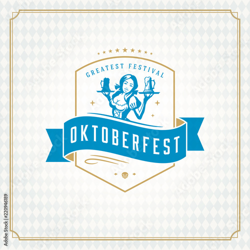 Sexy bavarian girl with beer mug and pretzel, vector illustration in paper art style. Oktoberfest, the worlds largest beer festival banner, poster template with red ribbon, wheat ears and hops.