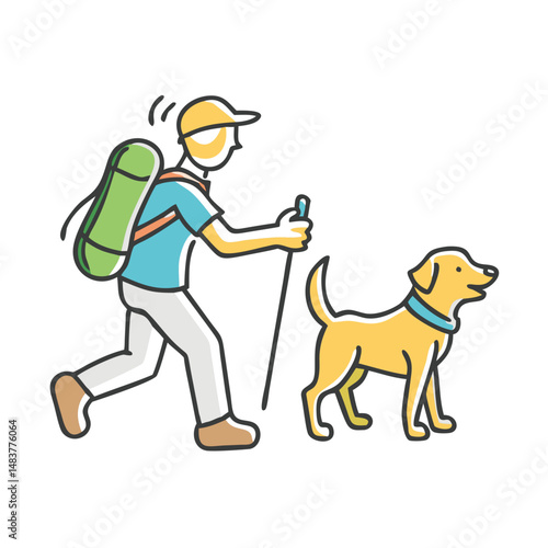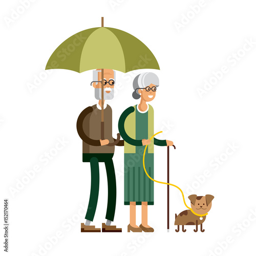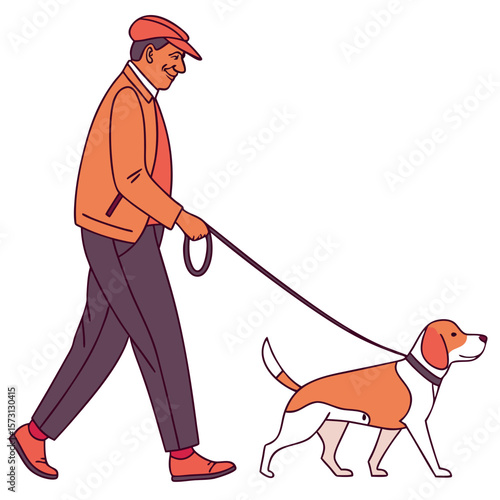 Old man carrying shopping bag walking his dog and drinking water vector icon isolated background.