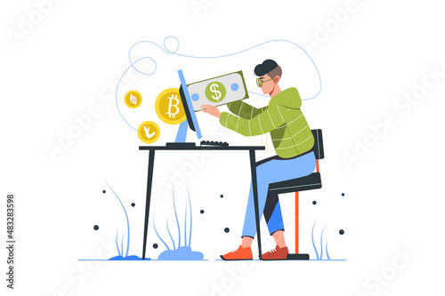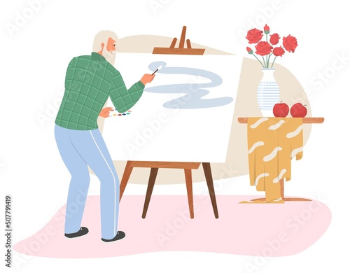 Old person vector. Aged man painting on canvas scene. Retired painter artist. Hobby and leisure on retirement. Art class for elderly people