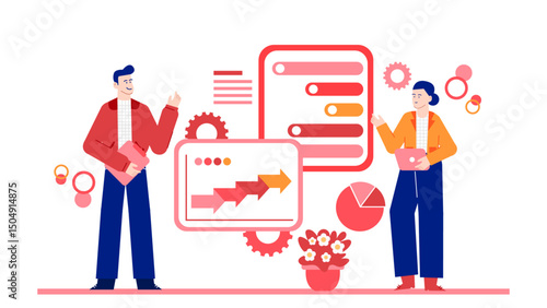 Business people making financial transactions online using huge smartphone with mobile banking application, vector flat style design illustration. Online bank, money transfer, electronic payment.