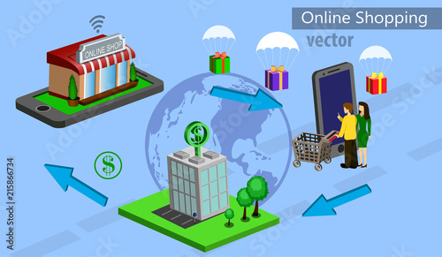 Online banking vector flat 3d isometric illustration. Desktop computer with bank building, bank employees and customers. Internet banking or electronic payment system concept design element.