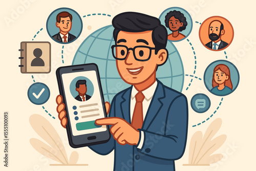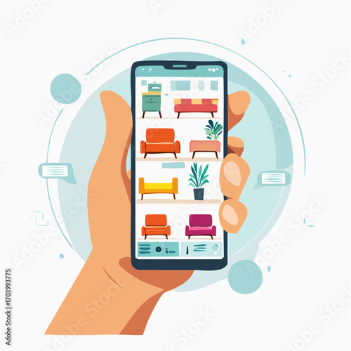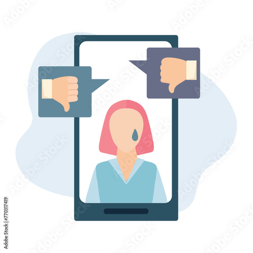 Makeup and cosmetics online store, vector flat illustration. Woman making purchases of face sheet mask, cream, eye patches, mascara, facial massager. Skin care and beauty products online, e-commerce.
