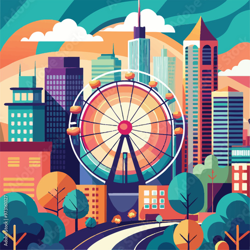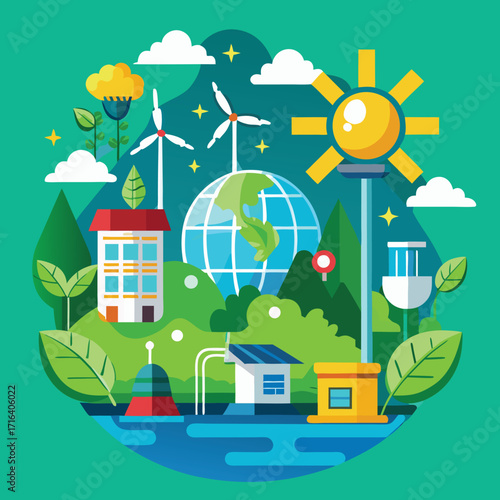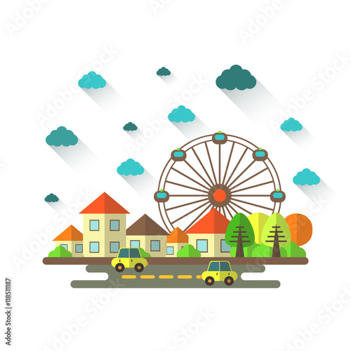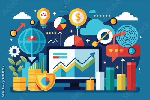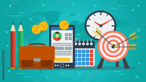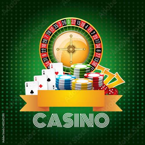 Online casino concept vector flat illustration. Roulette wheel, slot machine game on computer screen, red and green dices, dollar coins, wallet with money. Internet casino gambling poster, banner.